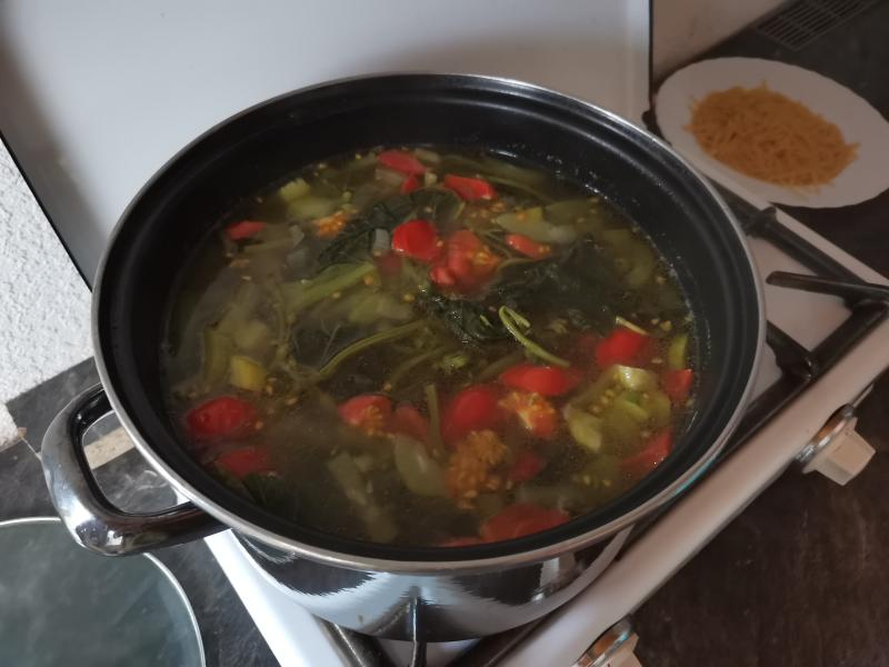 Ich hab mir gestern vom Italiener die Suppe mit Zucchini lunghe kochen lassen. Die war genau richtig zum Sonnenuntergang an so einem warmen Tag. Foto 6 Minuten vor Schluss.