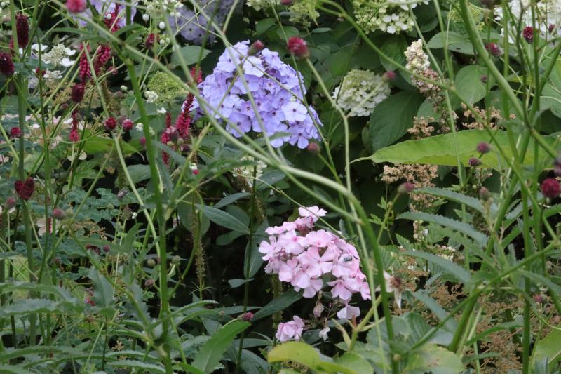 Diesen weißen Phlox, den ich namenlos aus der Nachbarschaft erhielt, möchte ich nicht mehr missen. Er ist ein wunderbarer Stimmungsbringer mit seinen weißen Blütengebirgen, die gut 1.6 m hoch aufragen. Rechts noch ´Rijnstroom´und darunter ein anderer, namenloser Phlox aus der Nachbarschaft.