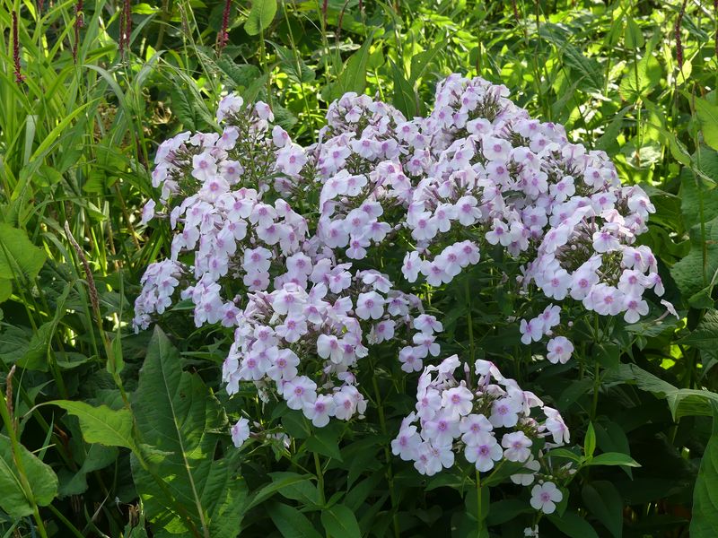 Diesen weißen Phlox, den ich namenlos aus der Nachbarschaft erhielt, möchte ich nicht mehr missen. Er ist ein wunderbarer Stimmungsbringer mit seinen weißen Blütengebirgen, die gut 1.6 m hoch aufragen. Rechts noch ´Rijnstroom´und darunter ein anderer, namenloser Phlox aus der Nachbarschaft.