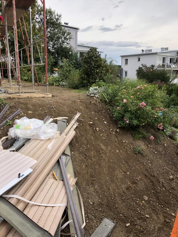 Im Endeffekt muss eben dieser Böschungsbereich, der die Baggerauffahrt darstellte, und der Rasen davor (wo auch die Erdwärmebohrung stattfindet und bereits Rohre verlegt wurden, neu angelegt werden.