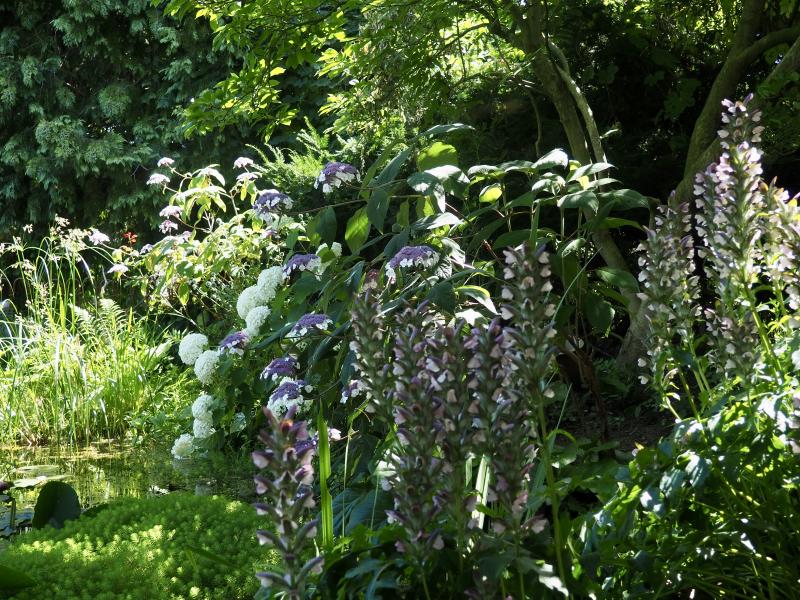 Geruhsamer Sonntag mit noch angenehmen Temperaturen. Nach wochenlanger Trockenheit stehen jetzt aber zwei sehr heiße Tage bevor... Am großen Teich wuchern Acanthus und Hortensien trotzdem noch ganz üppig vor sich hin... Dank Beregnung aus dem Wasserschlauch.