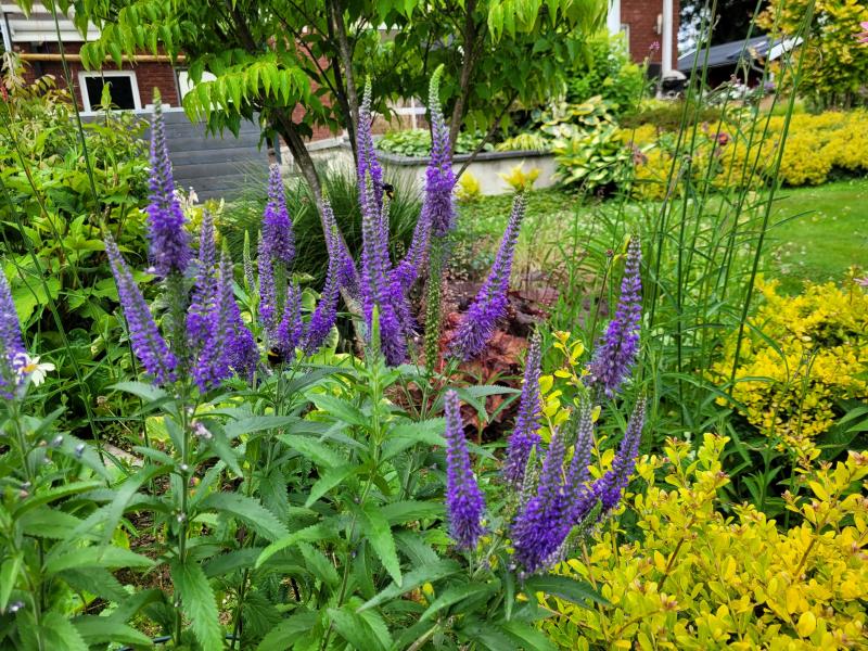 Veronica longifolia `Dark Maedje´, seit vielen Jahren Jahren im Garten, samt sich zuverlässig aus. Dahinter gelbblühendes Currykraut.