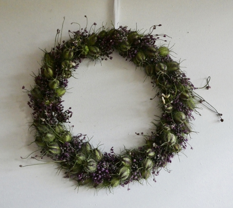 Und als Kontrast ein strubbeliger Kranz aus Nigella und Allium scorodoprasum.