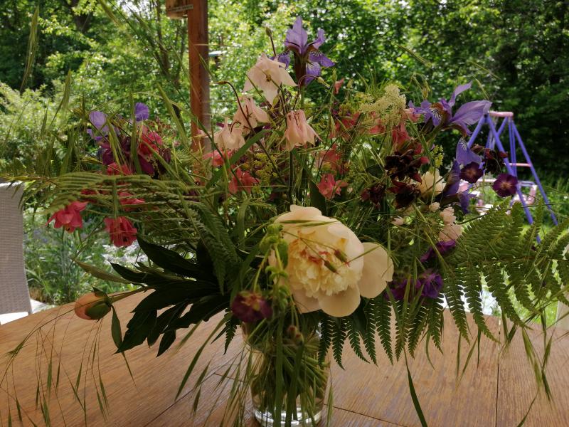 Geburtstagsstrauß für meine Tochter. Einmal quer durch den Garten, mit gerupftem Ungras. Dazu gab es genau eine (1) reife Erdbeere, die feierlich durch fünf geteilt wurde. ;)