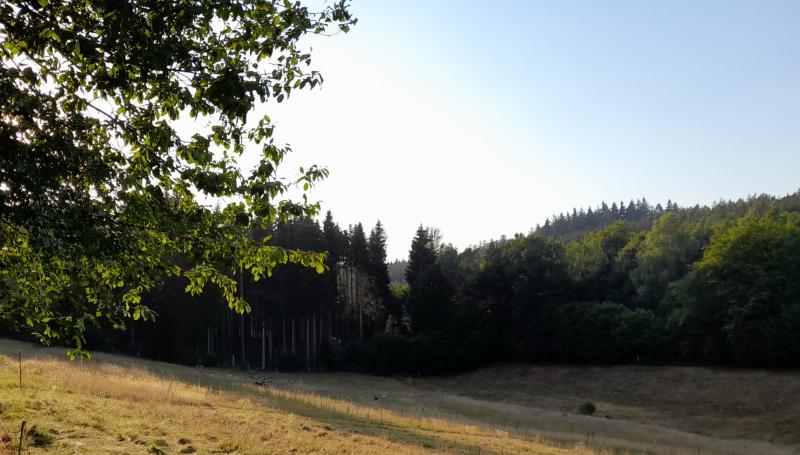 Gönnen wir uns schell noch einen Blick auf jene Büwiesen von gestern Abend. Man sieht, dass ich noch vom Fichtenriegel profitiere. Weil der aber "erntereif" ist, habe ich mit den beiden starkwüchsigen Apfelsorten angefangen vorzusorgen. Im Winter kommt noch ein dritter Baum. Ohne Schatten wäre den Tieren das nicht zuzumuten. Morgens liegen sie oben wie die Perlen aufgereiht an der Hecke, an der ich ja auch die Kopfweiden gepflanzt habe. Bloss keine Lücken in der Hecke. Aus verschiedensten Gründen. Gestern Abend habe ich die drei gegossen. Die sehen richtig gut aus.