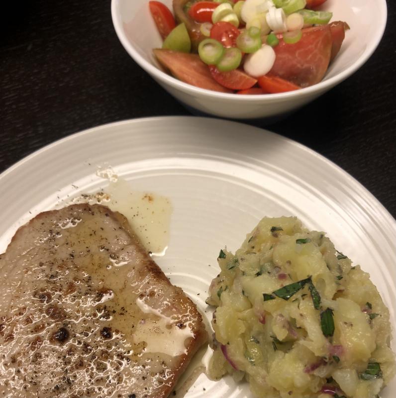 Bei uns gab es heute zartes Kalbschnitzel mit Madeira abgelöscht, matschigen aber leckeren Estragon-Kartoffelsalat (Essig, Öl, Senf) und einen kleinen Tomatensalat
