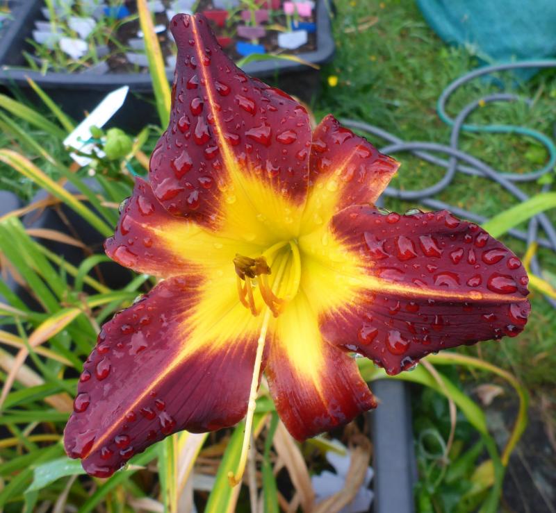 Und noch eine Unbekannte, die heute gegen die morgendliche Regentrübheit anleuchtete. Müsste ebenfalls eine Sorte sein, aber es ist nicht Fooled Me, deren Blüten wesentlich derber sind.