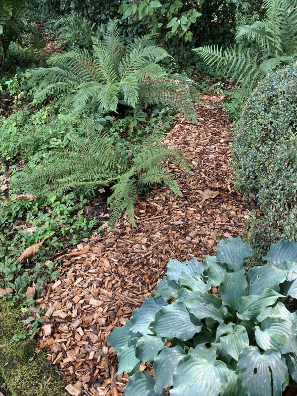 Der Rosengang sieht wieder gut aus. Mauer repariert, Pergola Hölzer ersetzt, Zugang verbessert und Mulch als Wegbelag.