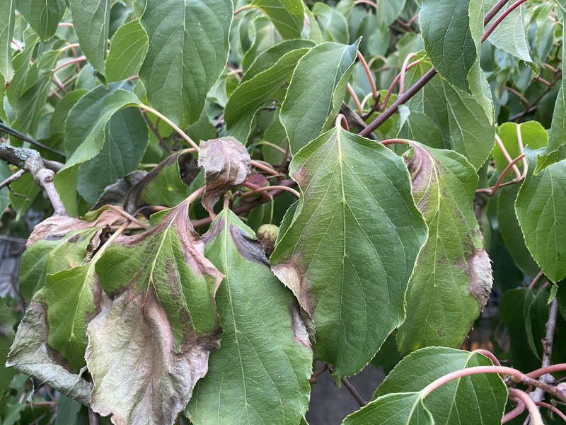 Mein Minikiwispalier steht zwischen den Häuserzeilen, Argutas und Kolomiktas. Vor 10 Uhr und nach 15 Uhr gibt es da keine Sonne. Sonnenbrandschäden wie auf den Bildern kenne ich nicht, die stehen trocken und werden nicht gewässert - aber bislang klappt es. Einiges ist erfroren, aber da hängen noch mehr als genug Früchte dran.