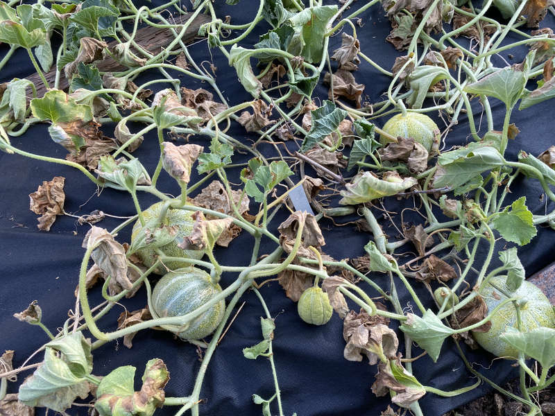 Die Melonen verbrennen ebenso. Egal wie bewässert wird. Es gibt einfach Grenzen. Unbeschattete Pflanzen sahen nach den 40° so aus: