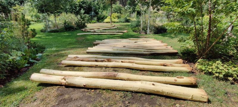 Und zwischendrin haben wir Zaunpfähle sortiert für die verschiedenen Abschnitte. Die sind nun markiert und in der richtigen Reihenfolge wieder aufgeschichtet. Zwischendurch sah es wohl nach Floßbau aus. ;D