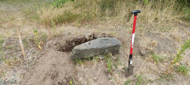 Heute haben wir den Steinhaufen vergrößert. Am Rand der neuen Fläche schaute ein Stein aus dem Wall, der dem Zaun im Weg war. Da brauchten wir die ganz großen Brecheisen. ;)