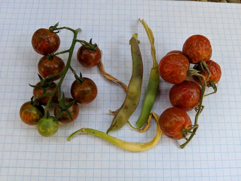 Dass ich um diese Zeit schon kiloweise Tomaten ernte ist wirklich ungewöhnlich. Nicht nur im Gewächshaus sondern auch draußen sind schon welche reif. Eine Schüssel Stangenbohnen gab es auch noch, auch die sind ungewöhnlich früh dran, obwohl ich eher spät gepflanzt habe.