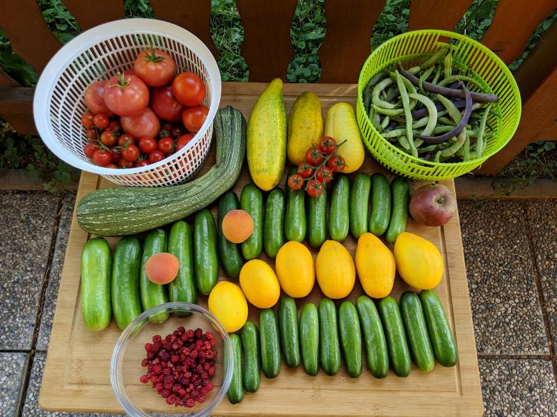 Gurken (minus drei die es nicht aufs Bild geschafft haben), Zucchini, Tomaten, Fisolen, Japanische Weinbeeren, zwei nicht ganz reife Marillen und ein wurmstichiger Apfel der frühzeitig vom Baum gefallen ist.