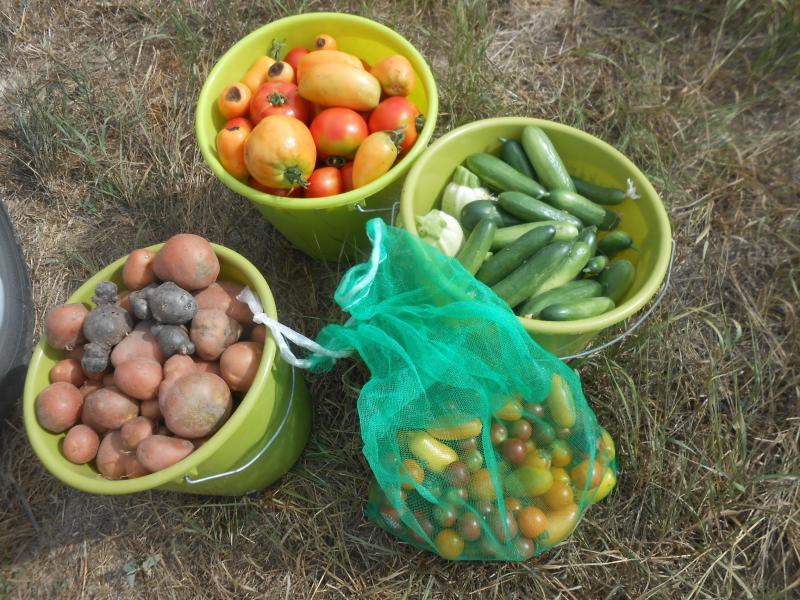 Das ist meine heutige Ernte vom Acker. In dem Eimer mit den Tomaten sind unten auch Kartoffeln. Ich weiß nicht wohin mit dem ganzen Segen, habe heute schon ein bisschen was verschenkt.