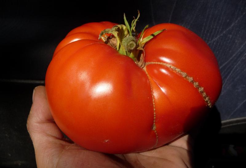 eine 677g Tomate. Ich mache noch nicht mal viel, die wachsen wirklich von alleine und ohne zu gießen.