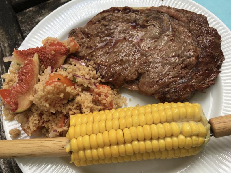 Letzter Urlaubstag :'( Wir haben gegrillt. Rib-Eye-Steak mit Maiskolben und Couscous-Salat.