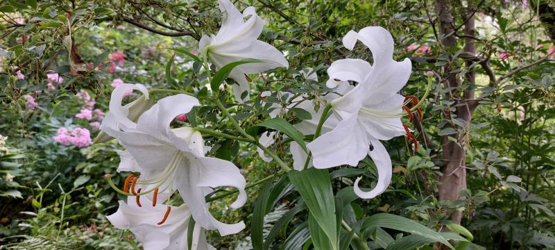 Die Üppigkeit, welche ich hier in manchen Gärten sehe, ist wahrscheinlich nur durch ausreichende Regenfälle oder intensive Bewässerung möglich. Ich versuche ja, den Garten so wenig wie möglich zu bewässern, und stattdessen Pflanzen zu finden, denen auch mehrwöchige Trockenheit nichts ausmacht. Wie immer gibt es Gewinner und Verlierer, und nach mittlerweile fünf Wochen so gut wie ohne Regen kristallisiert sich auch heraus, welche Gartenbereiche sehr trocken sind, und wo es womöglich noch ein wenig Restfeuchte gibt. Auch wenn der kleine Bach hinterm Garten nur noch ein Rinnsal ist, hält der fette Lehmboden das Wasser recht gut, und so präsentiert sich der Garten hinterm Haus zwar wild, aber dennoch ansehnlich: