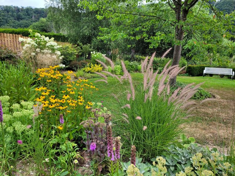 @Buddelkönigin: Neben der Üppigkeit deiner Beete bewundere ich am meisten den Hintergrund, den Ausblick in die freie Landschaft. (Der Schutz durch den umgebenden Wald hier hat zwar auch seine Vorteile, manchmal wünscht man sich dennoch einen freieren Blick.)