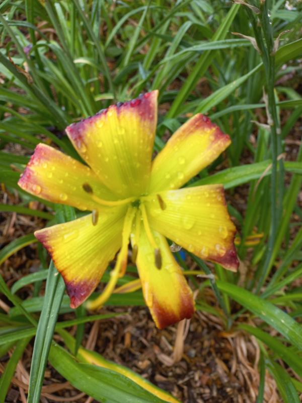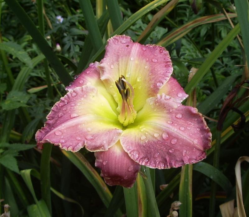 Sehr schön war heute morgen auch die Blüte dieser Sorte, zu der ich leider den Namen schuldig bleiben muss. Die Pflanze ist noch recht neu in meinem Bestand, der Name daher noch nicht so verinnerlicht (ja, okay, ich werde auch älter...) und da sie mitten drin steht und ich keine Lust hatte, im patschnassen Gewusel nach dem Schild zu fischen, muss das Foto halt so genügen.