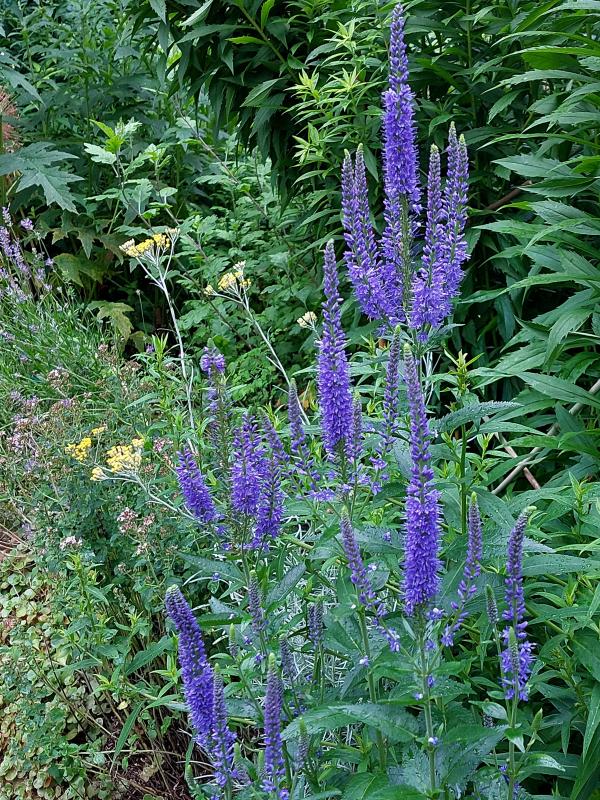 Veronica longifolia `Dark Maedje´, seit vielen Jahren Jahren im Garten, samt sich zuverlässig aus. Dahinter gelbblühendes Currykraut.