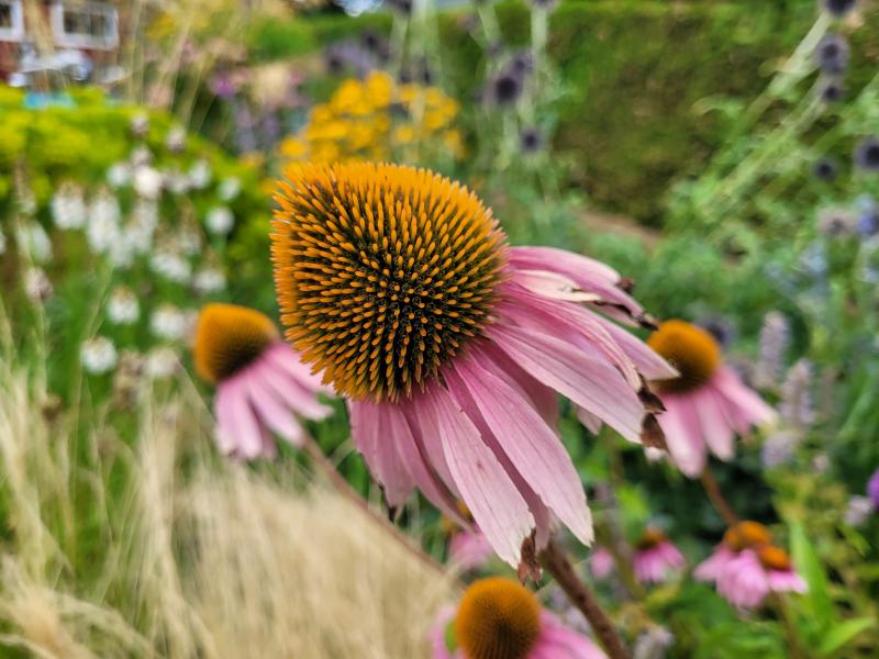 die "Igelköpfe" stehen in meinem Vorgarten leider zu schattig. Deshalb blühen schön, aber stets nur mit ein paar Einzelblüten. Hier reckt eine Echinacea ihren Igelkopf zwischen den sich entwickelnden Blüten der Rispenhortensie Limelight hervor. Da dürfte ruhig mehr kommen.
