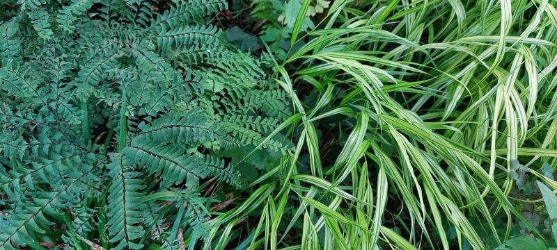 Hakonechloa gedeiht im Halbschatten besonders üppig und verträgt sich mit Farnen.