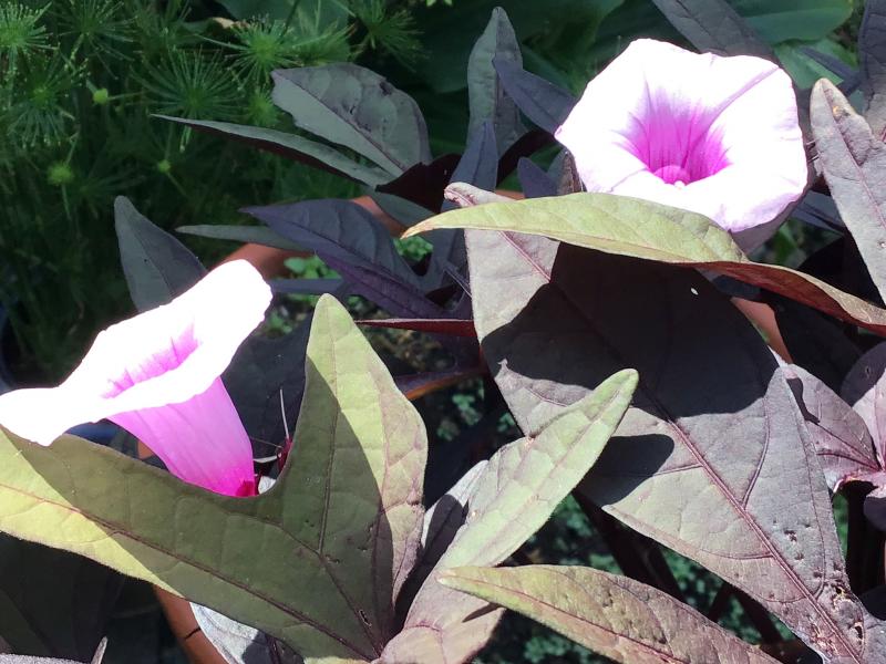 Die Süßkartoffel blüht im August leider verstecken sich die meisten Blüten im Lau