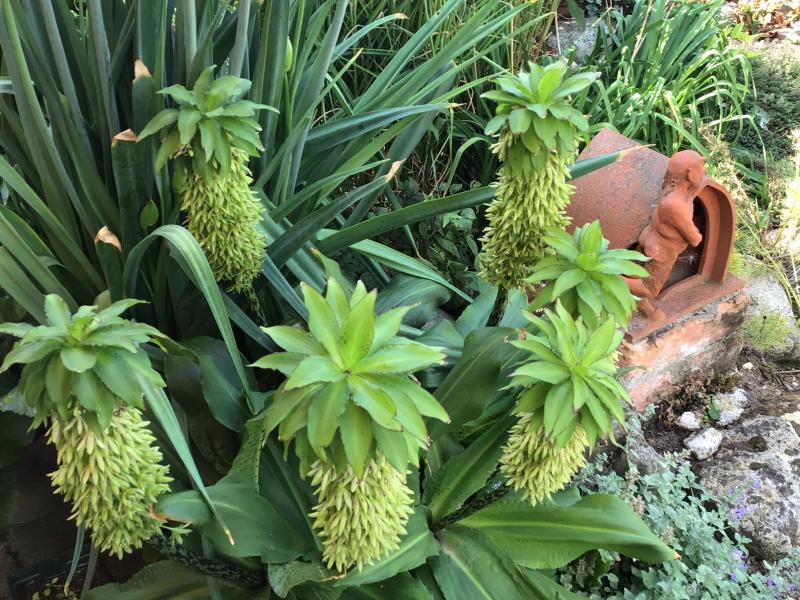 Auch die Ananaslilien laufen im August zur Hochform auf. Der Geruch ist nicht schön sie werden daher auch meist von Fliegen besucht