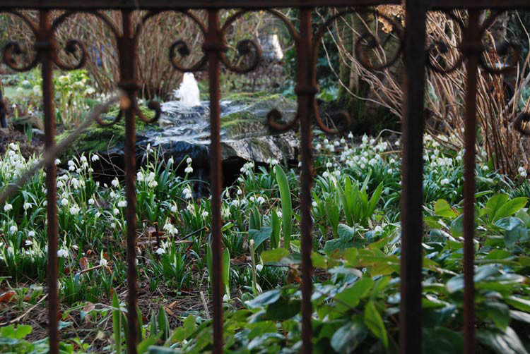 Hier ein Foto durch das Seitenenelement des Zauns zur Blütezeit der Märzenbecher, diese Märzenbecher galt es zu beschützen.
