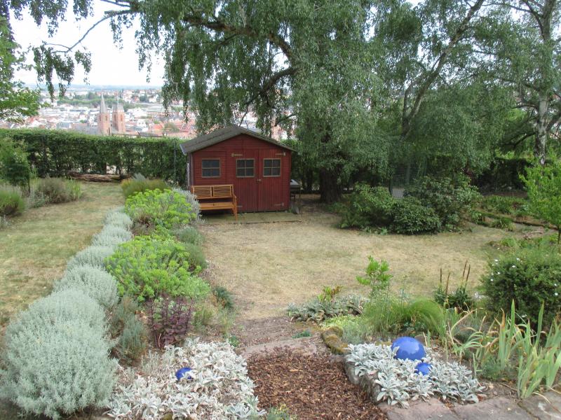Und noch ein letzter Blick auf den Schuppen für die Gartenmöbel, dahinter die Hecke und die Stadt mit der Stiftskirche.
