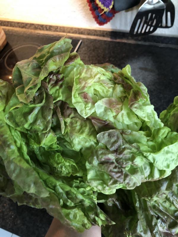 Vor ein paar Tagen habe ich die Kiste den Nachbarn mitgebracht. Unten die Schicht die man nicht sieht besteht aus Gurken, Zucchini, Tomaten. Die beiden Salate kamen obendrauf.