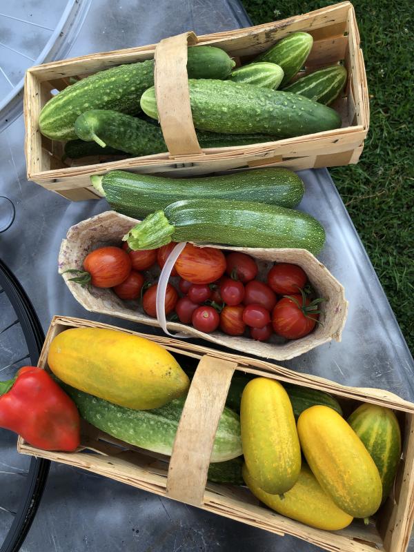 Heute habe ich mal nichts geerntet, aber gestern wieder eine Menge Tomaten und Snackgurken.