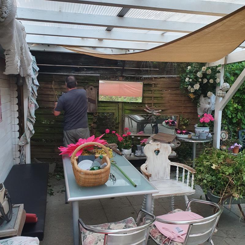 GG reißt gerade das Efeu von der Trennwand zum Nachbarn ab, wird gleich das Plexiglas demontieren und Nachbars Efeu aus der Regenrinne unserer Terrasse entfernen 🙈 ! Die Hunde schlafen wie im Koma und ich gucke allen zu 😂