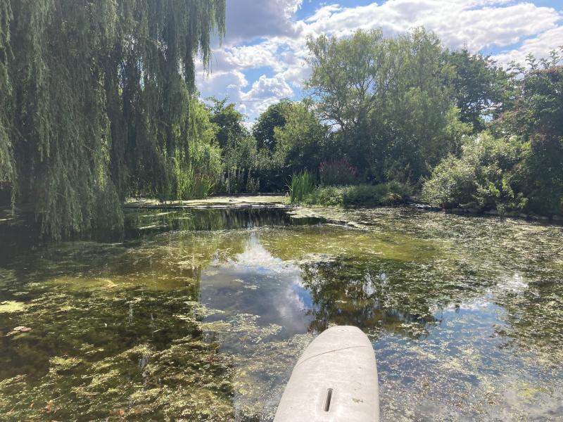 Schwimmen ist nicht mehr möglich. Auch die neuen Seerosen haben keine Chance, sich zu etablieren. Das liegt allerdings auch an den Nutrias, die uns weiterhin besuchen. Die Viecher fressen in nullkommanix alles ab. Auch im Filtergraben haben sie eine große Schneise hinterlassen.