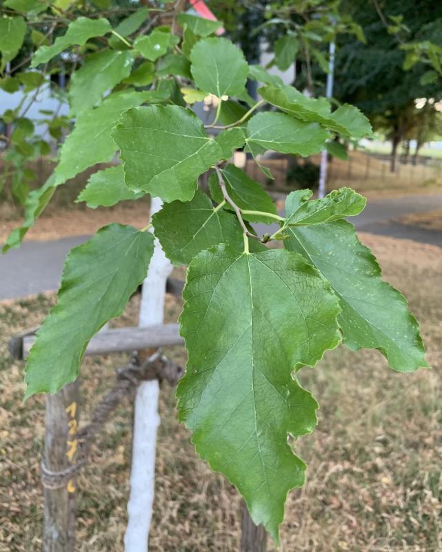 Zunächst letztes oder vorletztes Jahr durch die Stadt gepflanzte Exemplare (Parkfläche, in der diverse Gehölze auf Eignung bei Hitze und Trockenheit getestet werden). Beschriftet als Morus alba, Früchte sind noch nicht dran, die Blätter fühlen sich glatt an (Oberseite wie Gummi).