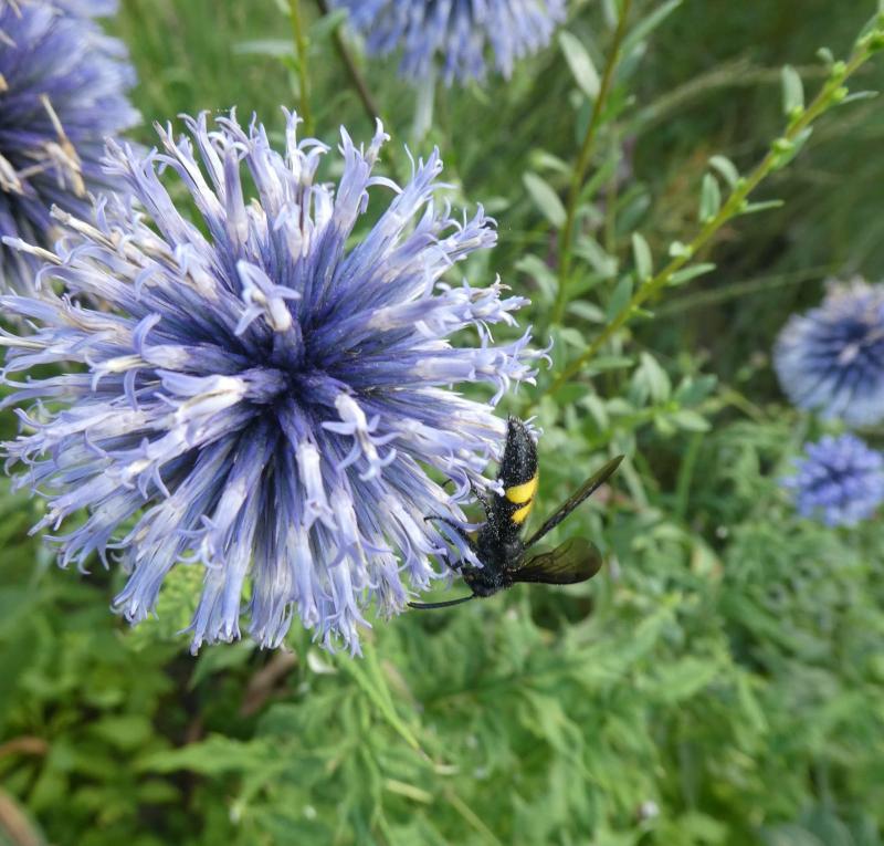 Im Oilenpark ist Echinops ritro aufgeblüht. Und sofort stellt sich auch die Borstige Dolchwespe Scolia hirta ein. Der Tisch dürfte für die Larven reichlich gedeckt sein (Engerlinge u.a. von Gartenlaubkäfern und Rosenkäfern).