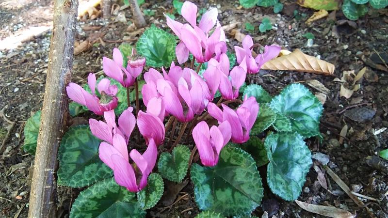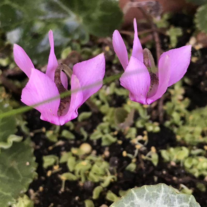 Und ein sehr dunkel sein sollendes (und als solches extra geordertes) Cyclamen hederifolium blüht schon, aber ganz gewöhnlich rosa...