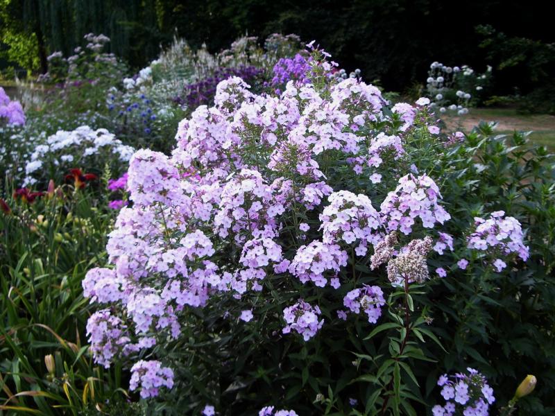 In #705 ist ein Phlox mit mittlerer Blütengröße und weißen Blüten zu sehen, zu dem ich kein Schild finde und der auch ein Sämling sein könnte. 'Hesperis' stand dort früher einmal, war aber schnell verschwunden, vielleicht durch Wühlmausfraß.