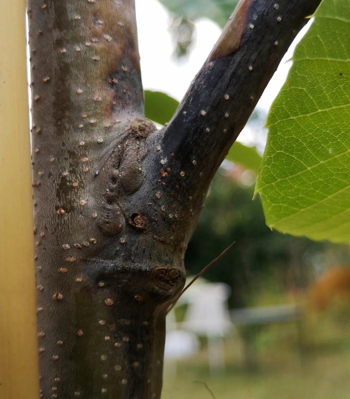 Ich bleibe aber bei meiner Korrektur, ich würde das schwarze nur wegschneiden. Der Baum ist noch jung und kann viel überwachsen, wenn man sich drum kümmert. Eine Schnittstelle kann ich dort übrigens nicht entdecken, aber eine ehemalige Andockstation für ein Blatt. Eine Eintrittspforte für allerlei was man nicht braucht.