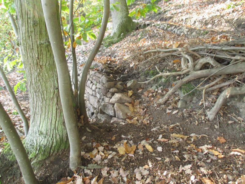 Ich denke schon, dass da vor 100 Jahren mal eine Mauer war. . Die Arbeitsweise ist etwas unkonventinell, funktioniert aber an dieser Stelle, weil der Hang durchwurzelt und stabil ist. Ich setze die neue Mauer etwas vor die Stelle der alten, damit ich die Wurzeln der Bäume nicht zu sehr störe. Pule die Steine raus, verbaue sie und fülle die Hohlräume zwischen den Wurzeln mit Mulm. Das kann man selbstverständlich nur bei feuchter Witterung machen. . Hier sieht man das Stück, welches ich noch vor mir habe. Da muss ich erst mal das Holz und Gestrüpp ab- und verräumen.