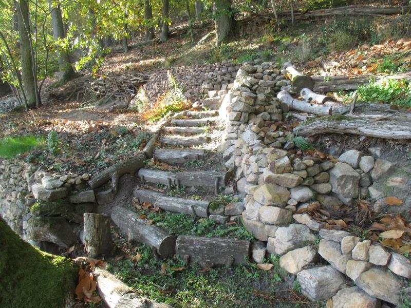Das sieht jetzt so aus: . Interessant dabei ist, dass ich die verwendeten Steine vor Ort aus dem Mulm zwischen den Wurzeln ausgrabe und so wie sie kommen setzte. Ich fräse mich mit meinem kleinen Handhäckchen durch den Hang.