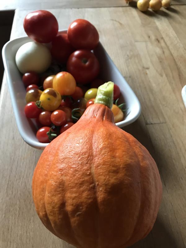 Ein kleiner Hokaido und verschiedene Tomaten von Jungpflanzen Bastelkönig sowie eine Zitronengurke. Die Hokaido wachsen wild aus dem verteilten Kompost im Vorgarten; ich habe sie gelassen, darunter blühen jetzt die ersten Cyclamen.