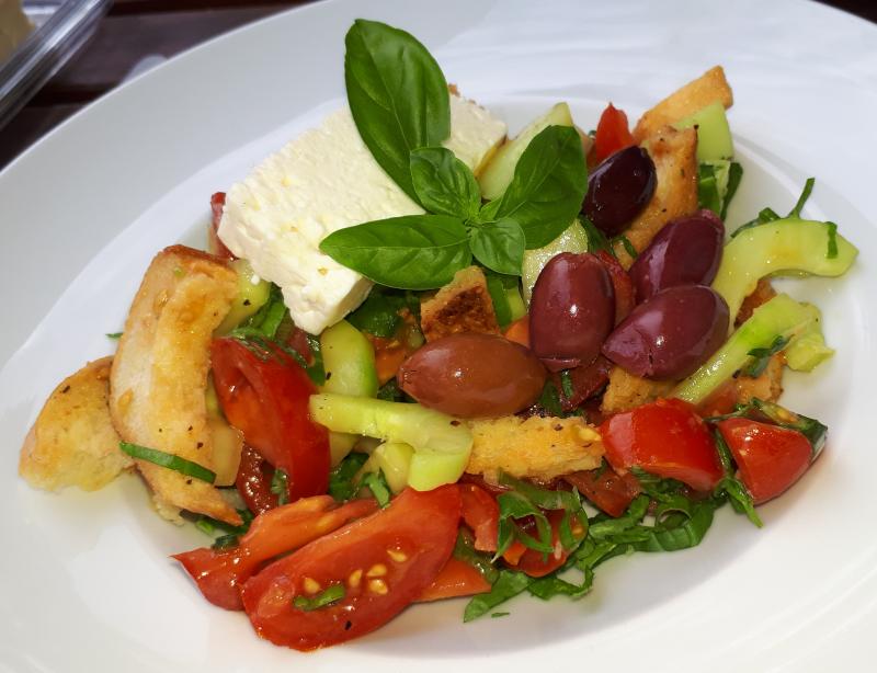 Brotsalat mit Tomaten und Gurken, Basilikum, Oliven und Schafskäse