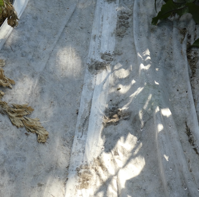 Ein Bild von Mitte Juli, da war das Vlies frisch und die Amseln hatten noch nicht entdeckt, dass man den Mulch auch aus dem schmalen Spalt zwischen den Pflanzen rauskratzen und überall verteilen kann. Inzwischen sehen die Vliese nicht mehr so makellos aus.