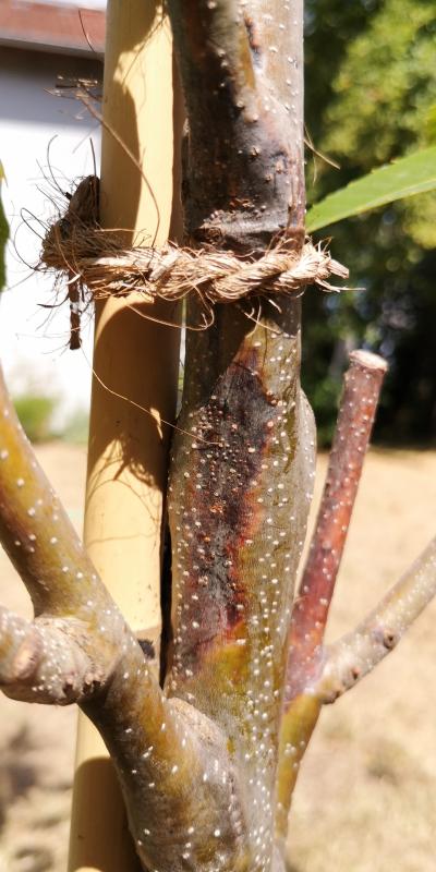Ich bleibe aber bei meiner Korrektur, ich würde das schwarze nur wegschneiden. Der Baum ist noch jung und kann viel überwachsen, wenn man sich drum kümmert. Eine Schnittstelle kann ich dort übrigens nicht entdecken, aber eine ehemalige Andockstation für ein Blatt. Eine Eintrittspforte für allerlei was man nicht braucht.