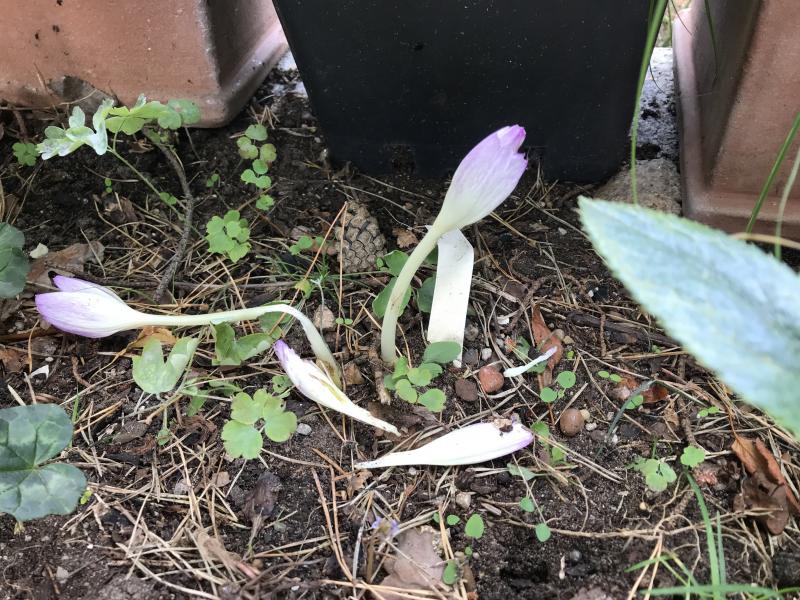 Die ersten beiden Herbstzeitlosen sind hier aufgeblüht, ´Autumn Queen´aka ´Princess Astrid´.