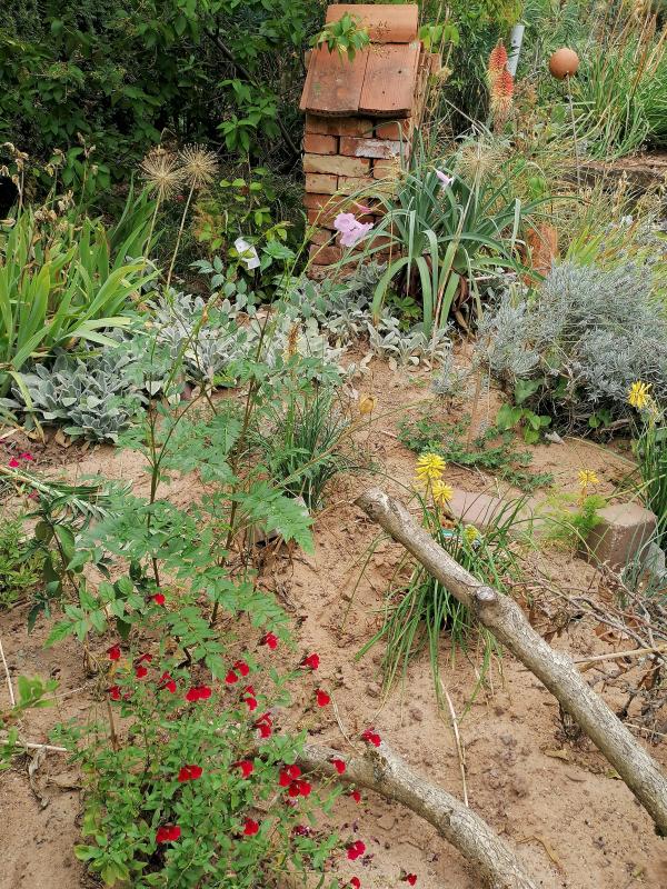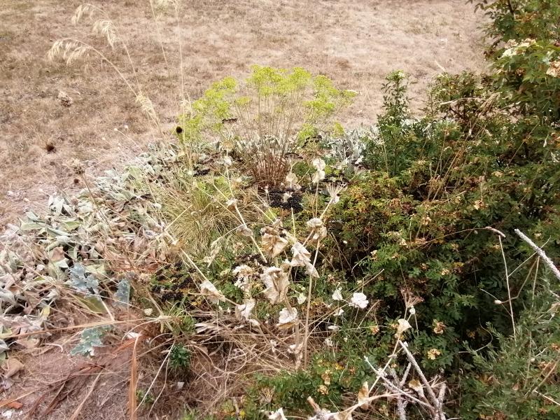 Diese Beete sind auf und an der Obstwiese, gezielt trockenverträglich bepflanzt, bzw. kühle und sonst feuchtere Ecken ausgenutzt. Wasser gibts nur aus der Tonne, und das wird für den Gemüsegarten verwendet.