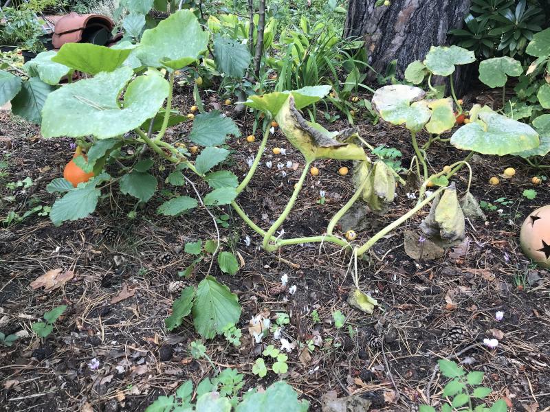 Ich drehe auch gespannt jeden Tag meine Gartenrunden und nehme jetzt auch die sich selbst ausgesäten Kürbispflanzen aus dem Beet, weil darunter überall Blüten zum Vorschein kommen.