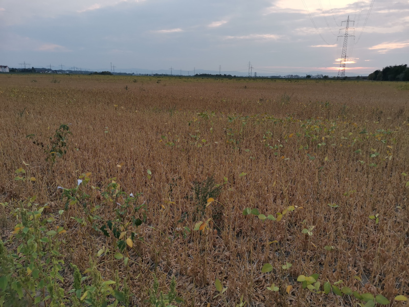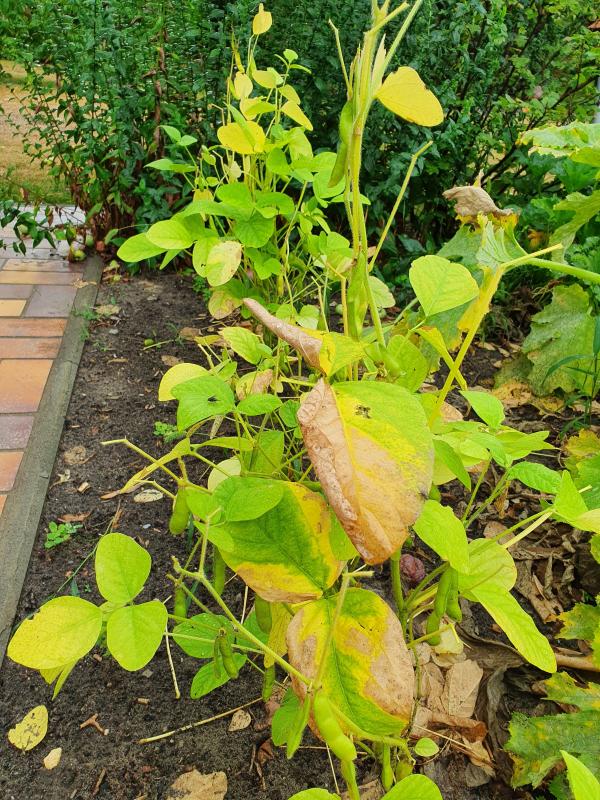 Edamame im Garten gelb, reift bald ab (wird aber vorher geeerntet). Felder mit Soja gelb, aber nicht vertrocknet oder tot. Die Fotos sehen nach Notreife aus, Korngrösse sollte dann gering sein. Aktuelle Sorten der Landwirtschaft: https://llh.hessen.de/pflanze/oekologischer-pflanzenbau/versuchswesen-oekologischer-pflanzenbau/ergebnisse-lsv-oeko-soja-2021-und-sortenbeschreibung/ - Ernte 1. Oktober.